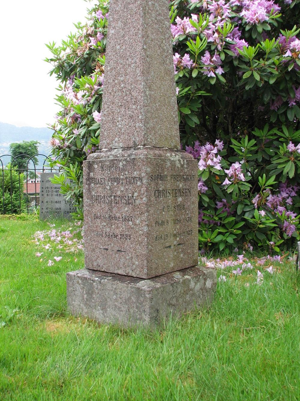 Gravstaden til familien Elster/Christensen er omgjeven av eit smijernsgjerde. Det er mange gravminne der, både yngre og eldre. Eit av dei eldste er eit obeliskforma gravminne med to namn på postamentet: