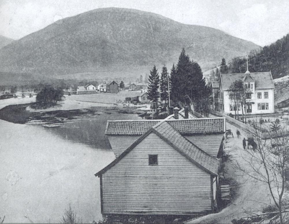 Hafstad Hotell around 1895. A lounge in the front of the picture, and some people in front of the hotel. The river Jølstra can be seen in the direction of Langebrua (bridge).