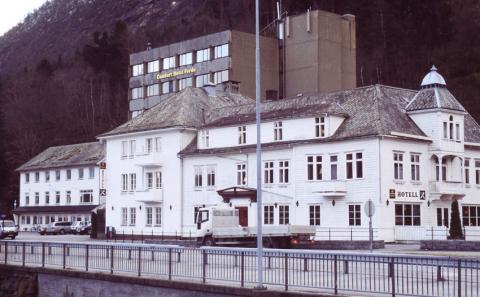 Førde Hotell in the autumn of 2001. The hotel presents itself as a heavy mixture of old and new, but it is still possible to recognize the old wooden-built building seen in pictures from a hundred years ago.