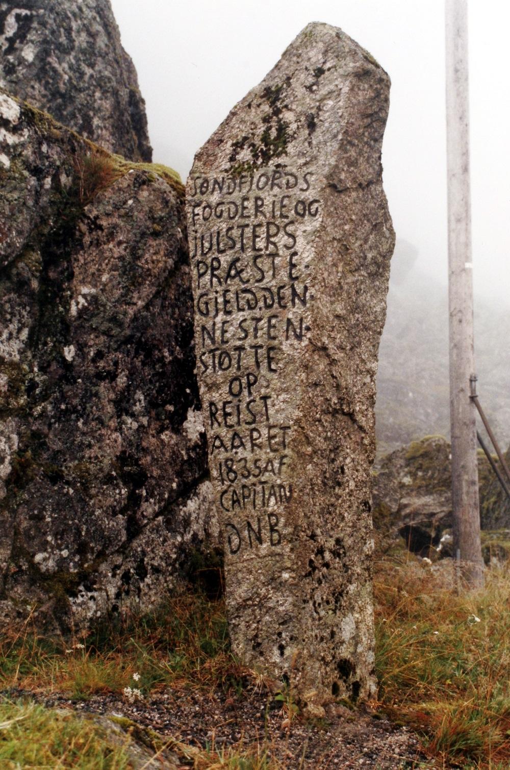 Steinen vart reist i 1835. Denne sida vender oppover/sørover mot "Søndfjords fogderie og Julsters præstegjeld."