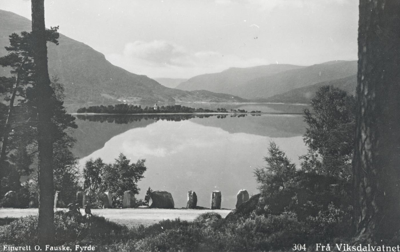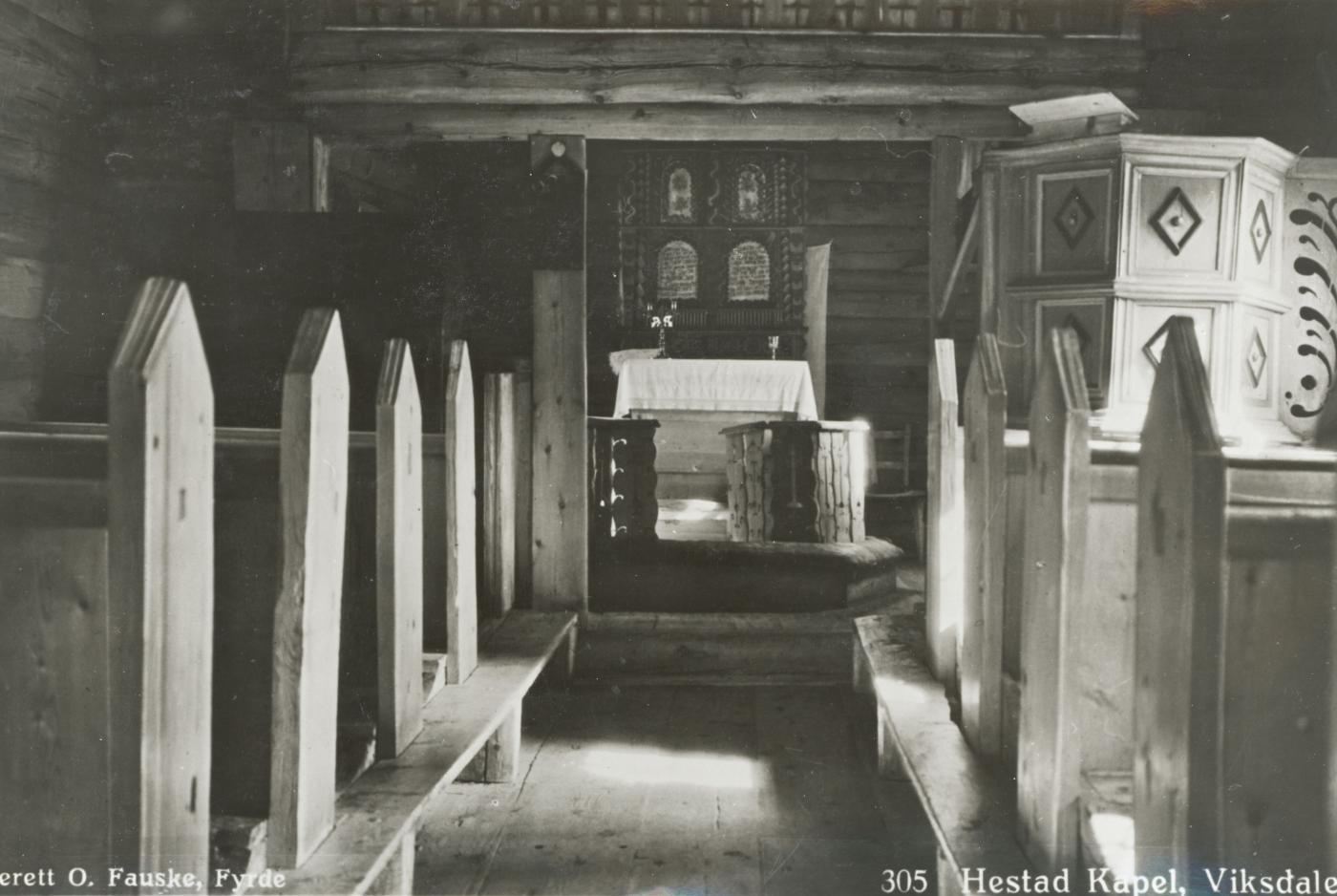 "En liden vakker, skogklædt holme i et langt bugtet vand, der smalner av til et trangt sund paa sydsiden, rundt omkring fjeld og aaser, dels nakne, dels klædd av furuskog, bare av og til litt lyst løv til at mildne indtrykket, - slik ligger Hestadkapellet i Viksdalvandet."