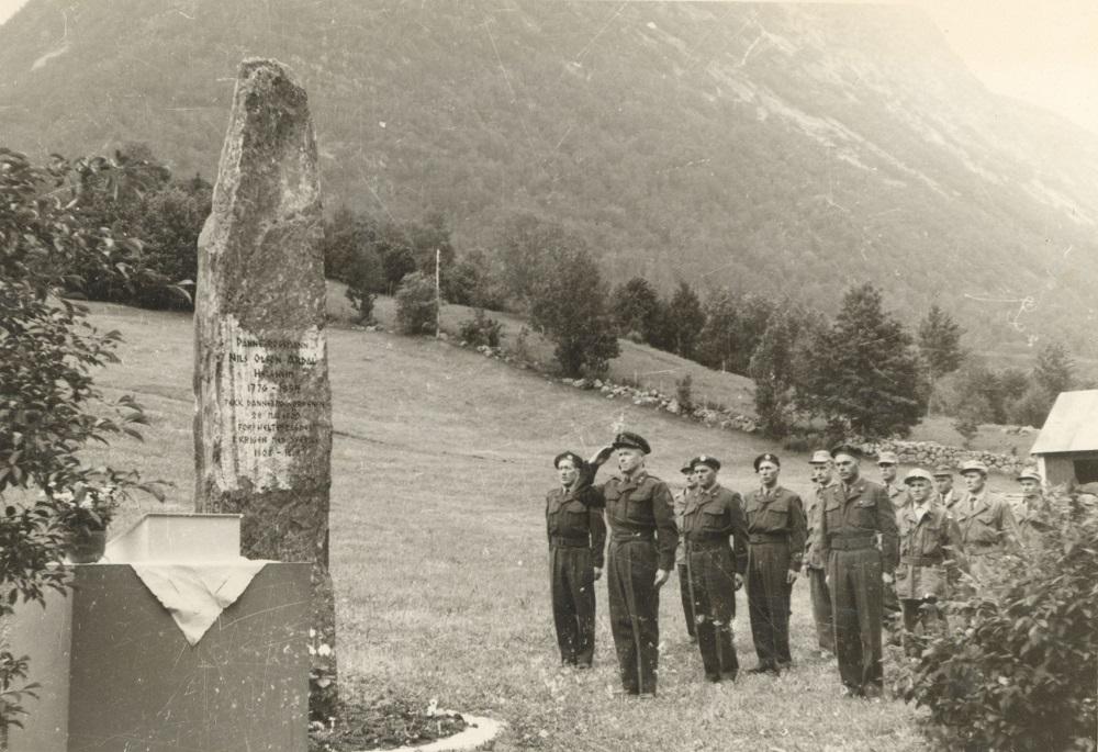 Frå avdukingshøgtida 5. juli 1964. Minnesteinen er avduka og ei tropp frå heimevernet i Jølster gjer honnør.