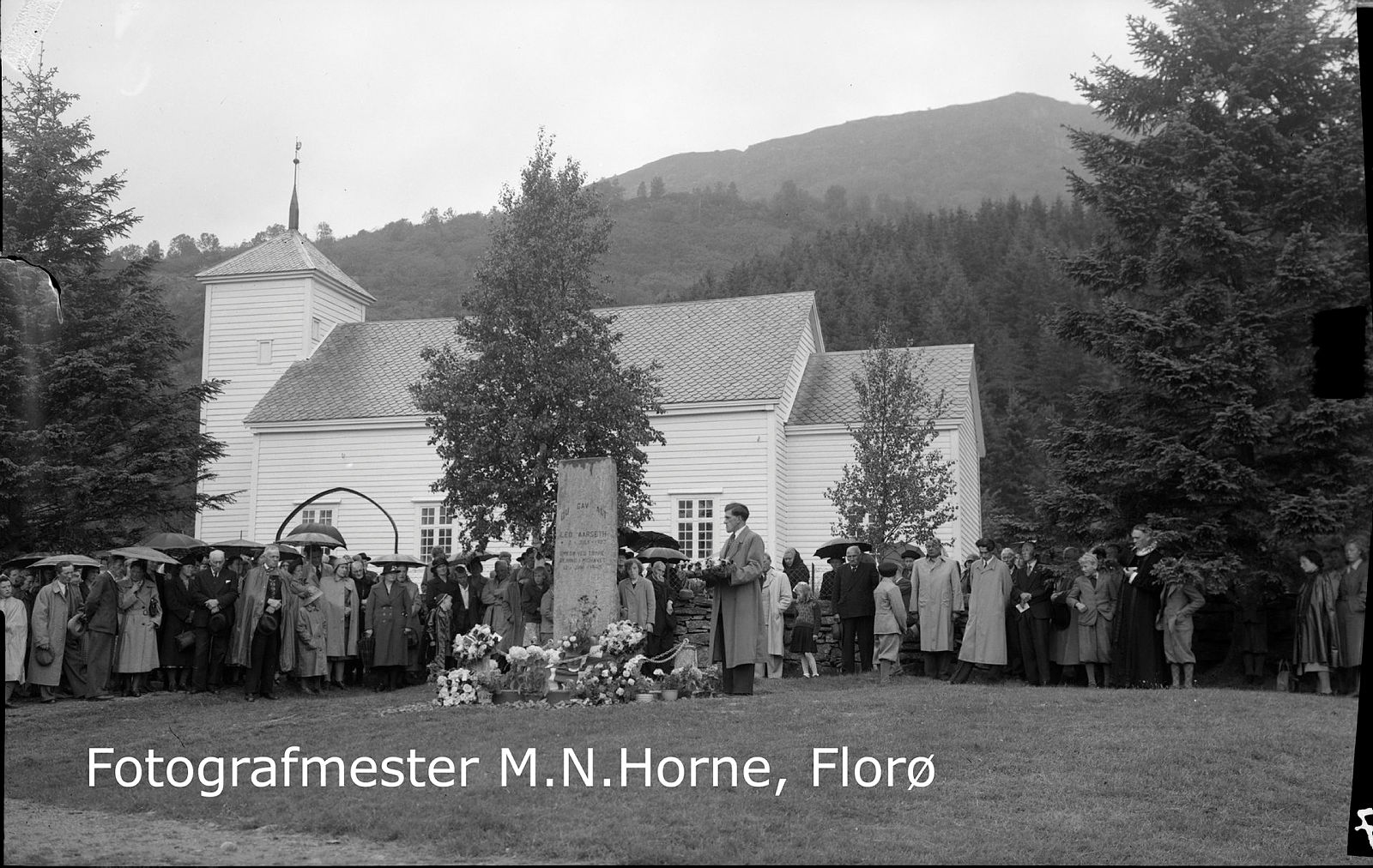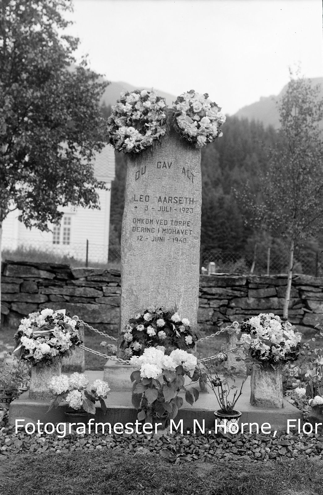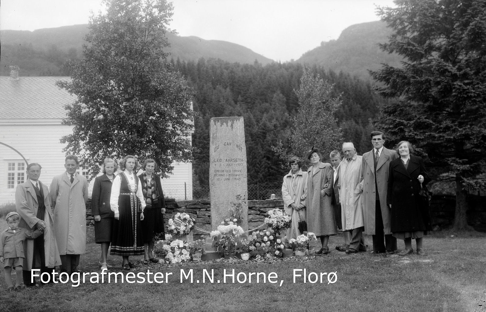 Frå minnehøgtida ved Vevring kyrkje, 1. juli 1951, då minnesteinen over Leo Aarseth vart avduka. Hjalmar Aarseth, bror til Leo, legg ned krans. Til høgre står sokneprest Aasmund Farestveit, og mennene i lyse frakkar er frå venstre handelsmann Torleiv Førland og ordførar Bertel Hundvebakken.