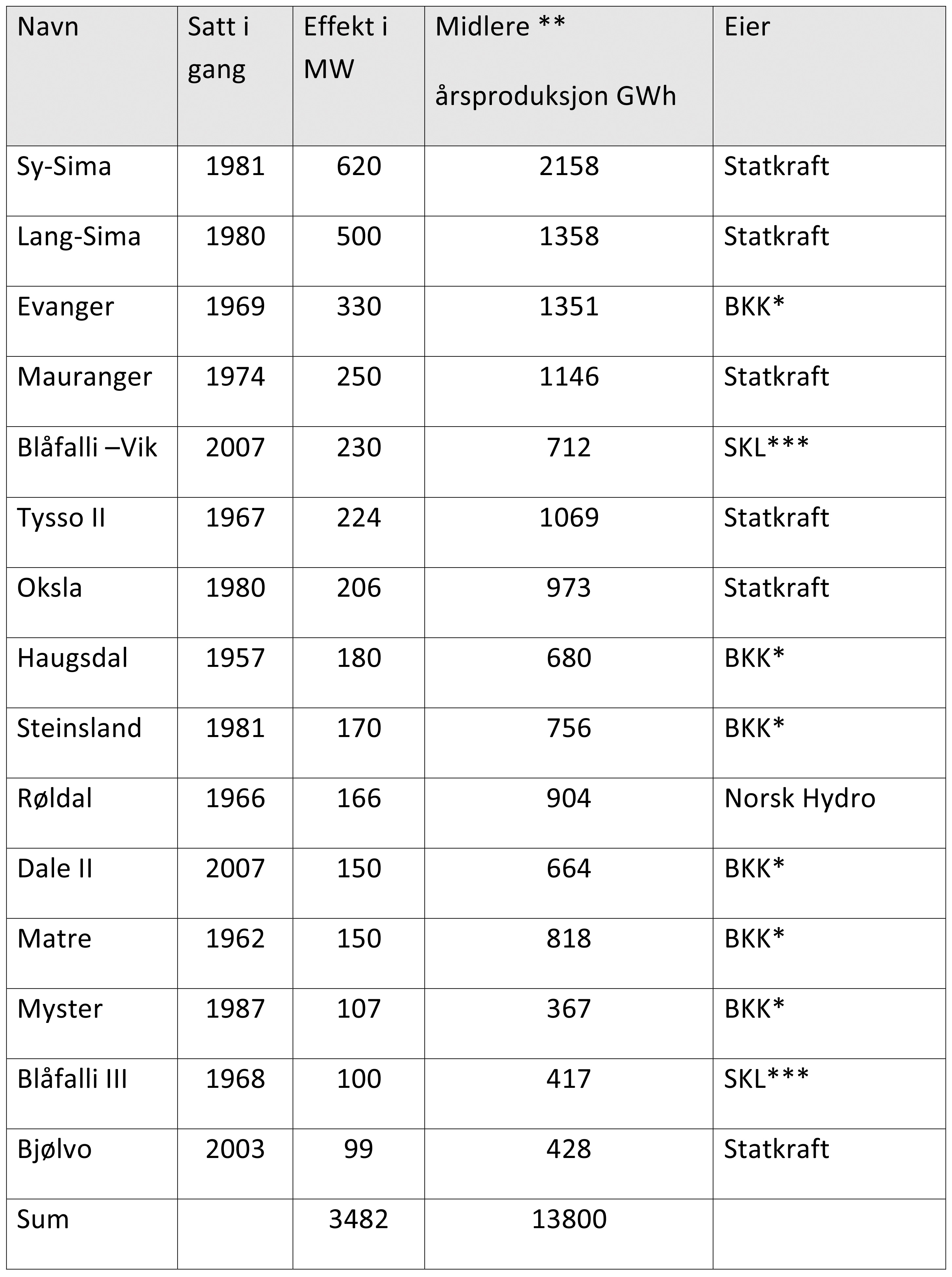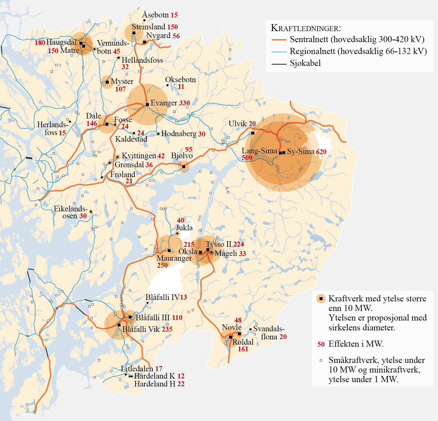 De 15 største kraftverkene i Hordaland utgjør bare 8% av antall kraftverk, men hele 80% av den total kraftproduksjon i fylket. 80% av antall kraftverk er under 10 MW, altså i gruppen småkraft og mikrokraft, men utgjør bare 7% av total kraftproduksjon. Mikro- og småkraftverk kan nok være viktige for den enkelte private eier, men betyr altså lite for kraftproduksjonsvolumet. Dersom alle de 189 kraftverkene (pr. 1.11.2016) i Hordaland produserer for fullt (se kartet i figur nedenfor) kan de samlet yte 4376 Megawatt (MW). Dersom vanntilsiget er som i middel for årene 1981-2010, blir den totale produksjonen 17354 Gigawattimer (GWh). Begge tallene er 13 % av Norges totale vannkraft og gjør at Hordaland er fylket med mest utbygd vannkraft, tett fulgt av Nordland og Sogn og Fjordane.