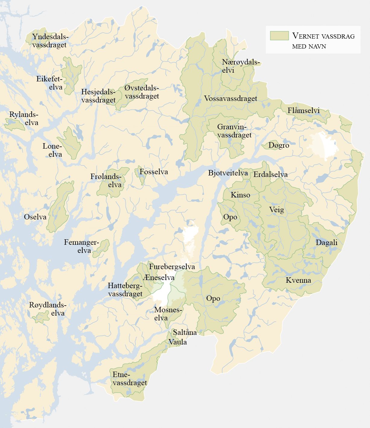 Allerede på 1950-tallet var det samfunnsrøster som uttrykte bekymring for at alle større vassdrag i Norge skulle bli bygget ut til vannkraftformål. Konfliktnivået økte utover på 1960-tallet. Stortinget ønsket å dempe konfliktnivået og nedsatte i 1969 et utvalg som skulle vurdere om noen vassdrag burde vernes mot kraftutbygging. Utvalgets første forslag ble behandlet av Stortinget i 1973 og i Hordaland ble Opo, Kinso og Oselva da vernet. Neste verneplaner behandlet Stortinget i 1980, og så i 1986. I 1993 ble en omfattende gruppe behandlet og Vosso og Granvinselva ble vernet. Nye vedtak kom i 2005 og så den siste runden i 2009. Vedtaket om Hardangervidda nasjonalpark i 1981 innebar fredning også av alle vassdrag i nasjonalparken. I Hordaland er totalt 27 vassdrag nå helt eller delvis vernet.