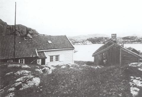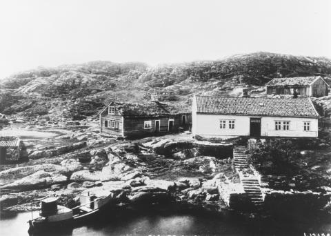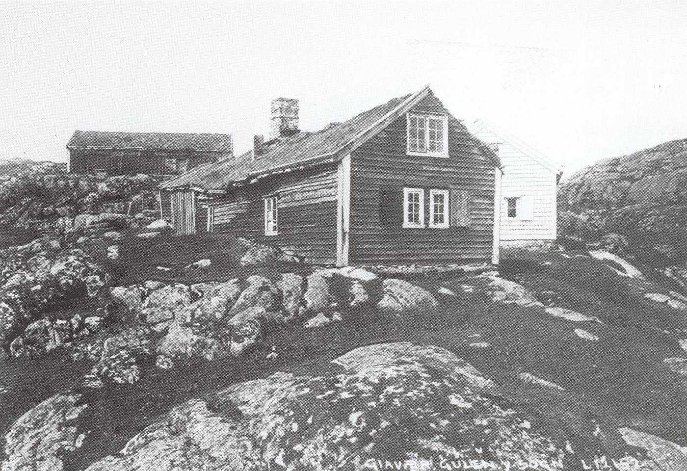 The inn of Glavær. To the left a "cooking house" for travelling farmers, in the centre "Bondestova" with a general store, to the right the residence , and in the background an outhouse and a barn.