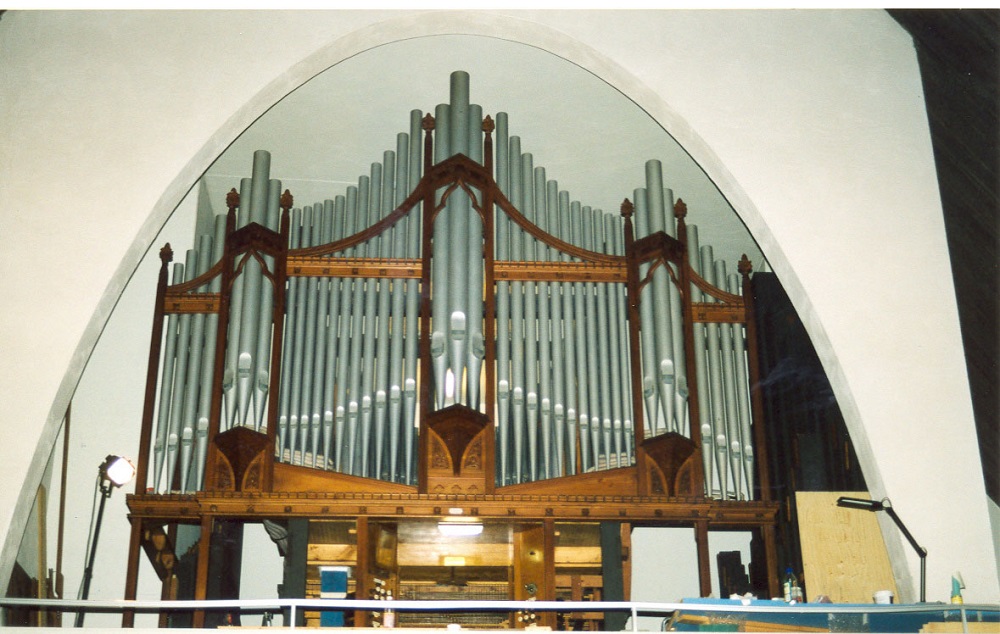 Det store vindauget syter for rikeleg lys inn mot skipet og kyrkjelyden. Den same bogeforma i eit noko mindre format tener som veggramme for orgelet på galleriet.