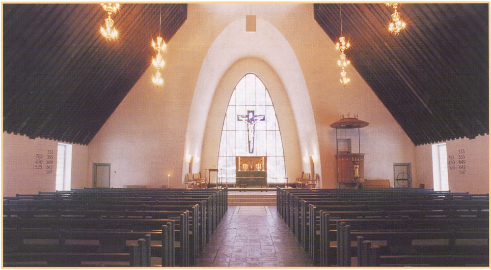 Innvendig er kyrkja kvitkalka, og golva er av raude teglsteinfliser. Vindauga er i antikkglas og har blysprosser. Det mest særmerkte med kyrkja er korveggen bak alteret, eit bogeforma vindauge i småruter som fyller nesten heile veggen. I midten er glasmåleriet av Jesus på krossen.
