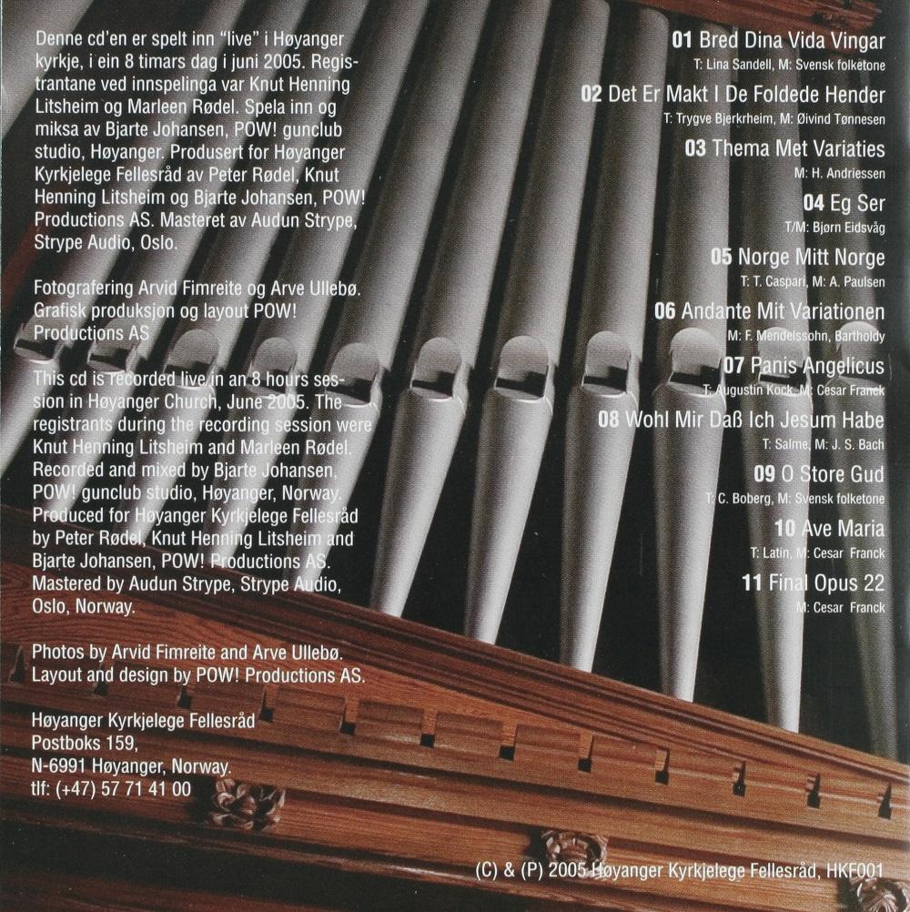 Hausten 2005 nådde tonane frå kyrkjeorgelet i Høyanger vidare. Då lanserte det kyrkjelege fellesrådet CD-en "Tonar frå Høyanger kyrkje". Cd-en inneheld tre reine orgelverk og åtte vokalnummer med Knut Henning Litsheim og Peter Rødel ved orgelet. Opptaka vart gjort i juni og Pow Productions i Høyanger stod for produksjonen.