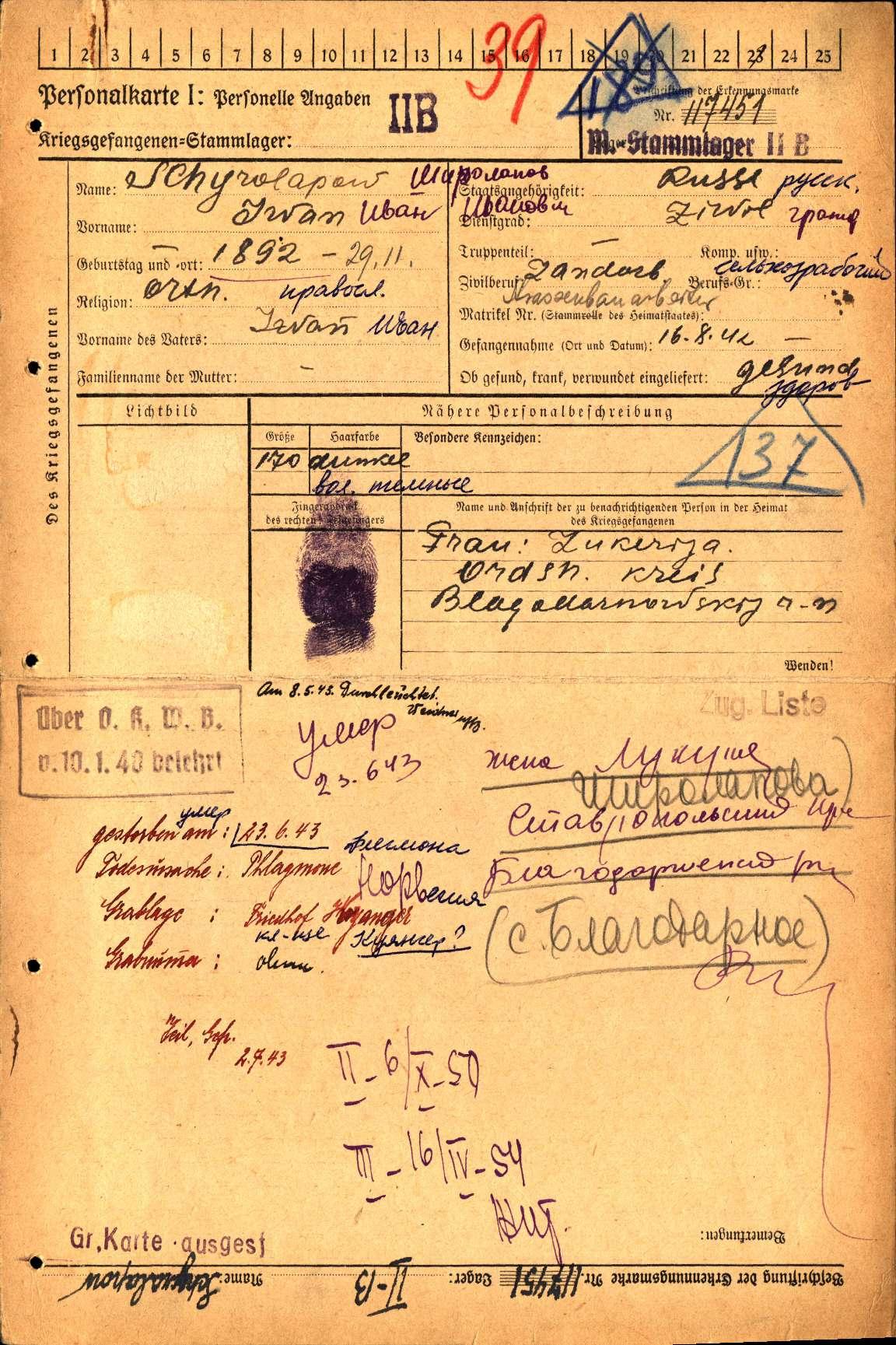 Tillegg 2009: Fylkesarkivet har fått tilsendt digital kopi av fangekortet til Iván Ivánovitch Shirolápov. Her går følgjande fram: a) faren sitt førenamn: Ivan, b) nasjonalitet: russisk, c) tenestegrad: sivil, d) yrke: landarbeidar, e) når teken til fange: 16.08.1942, f) sent til Noreg frå Stalag II, f) namn og adresse til ektefelle. vanskeleg å tyda, g) død: 23.06.1943, h) dødsårsak: slagskader. (Informasjon frå Marianne Neerland Soleim, Falstadsenteret.)