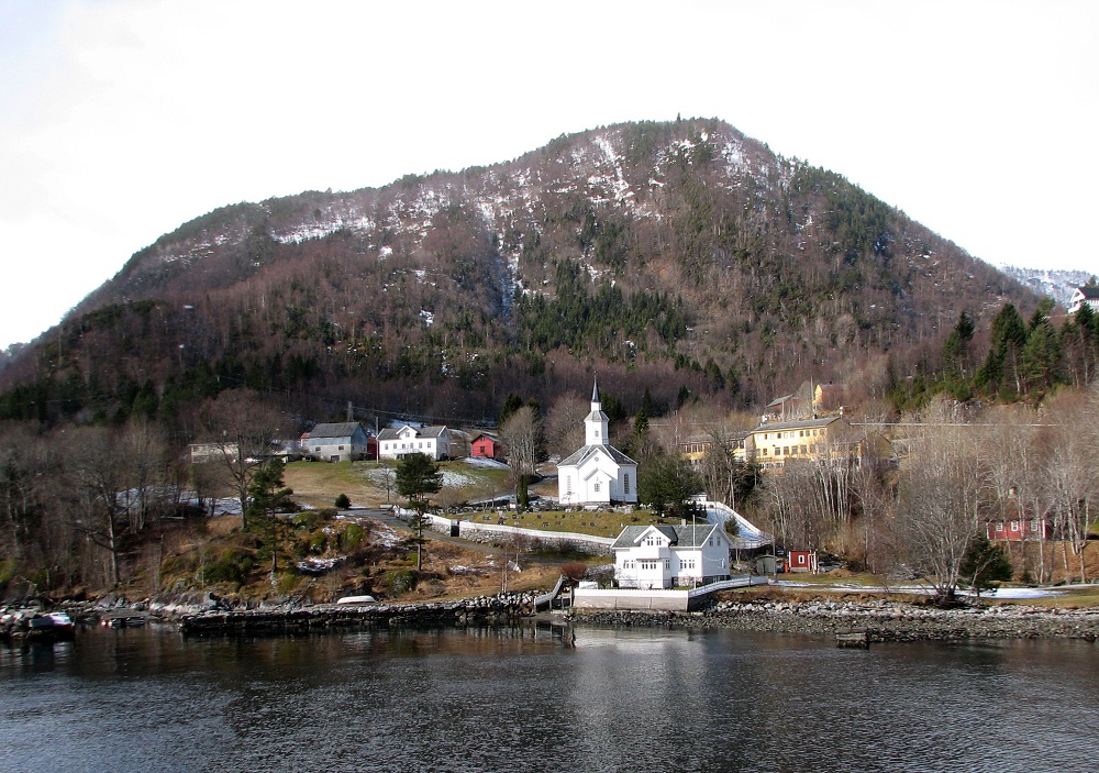 Lavik kyrkje. Skåsheim skriv om ”Tinghaugen vest for kyrkja” og ”Lavik-tunet”. Biletet viser området vest for kyrkja og tunet på garden Lavik midt på biletet.