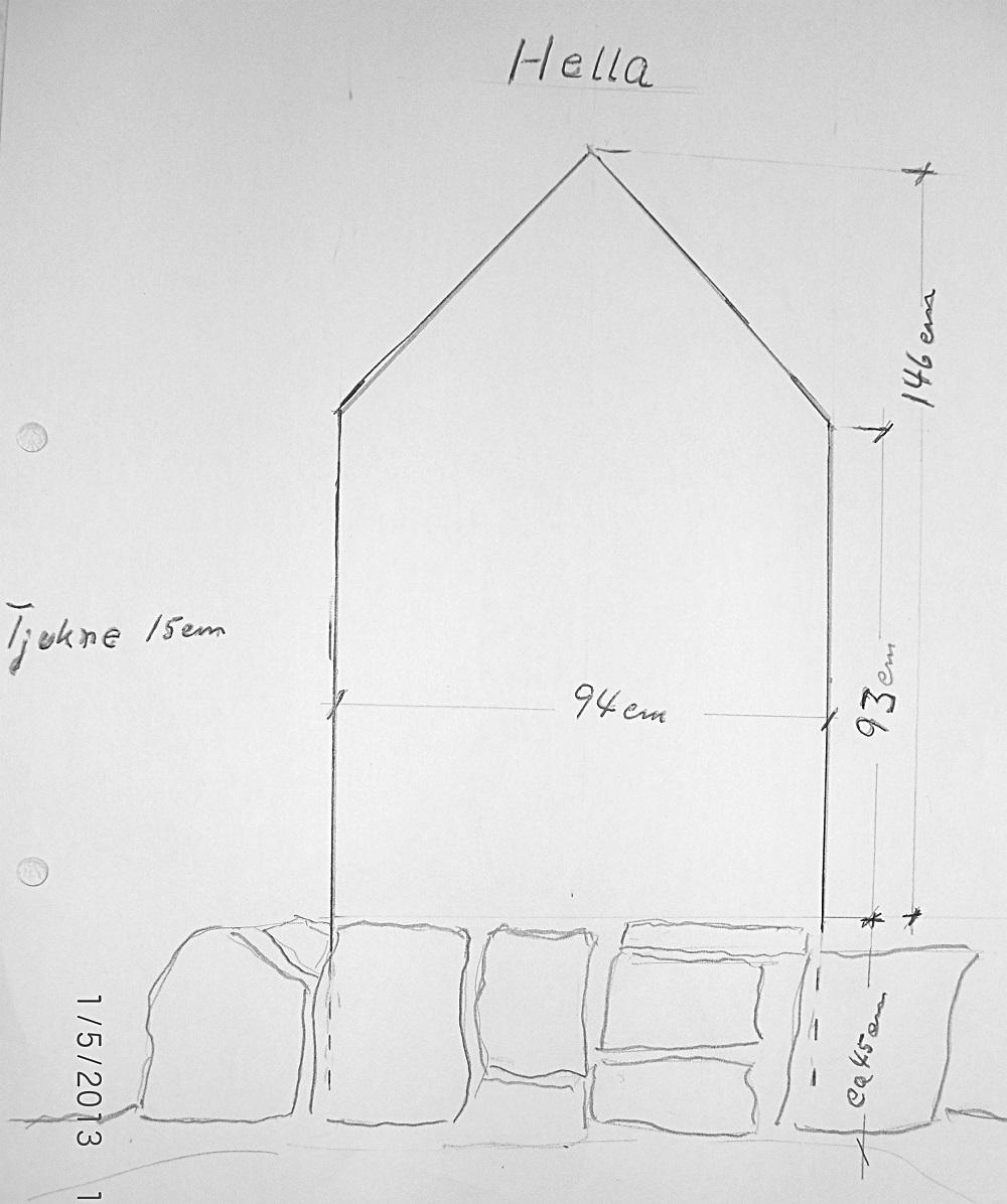 Nøyaktige mål på grensesteinen Hella: breidde 94 cm, tjukne 15 cm, høgd til spiss 146 cm. Steinsetjinga kring 45 cm høg.